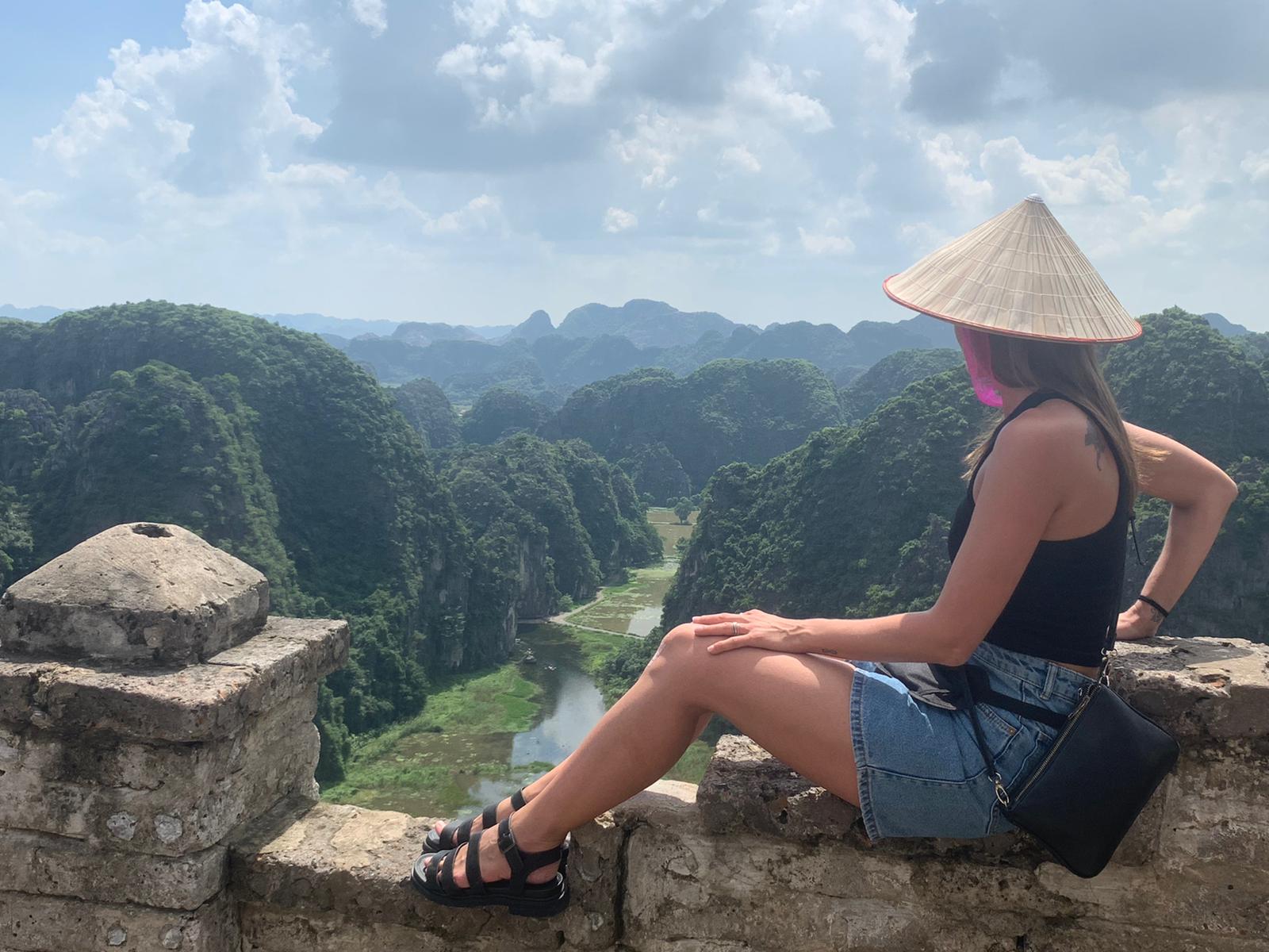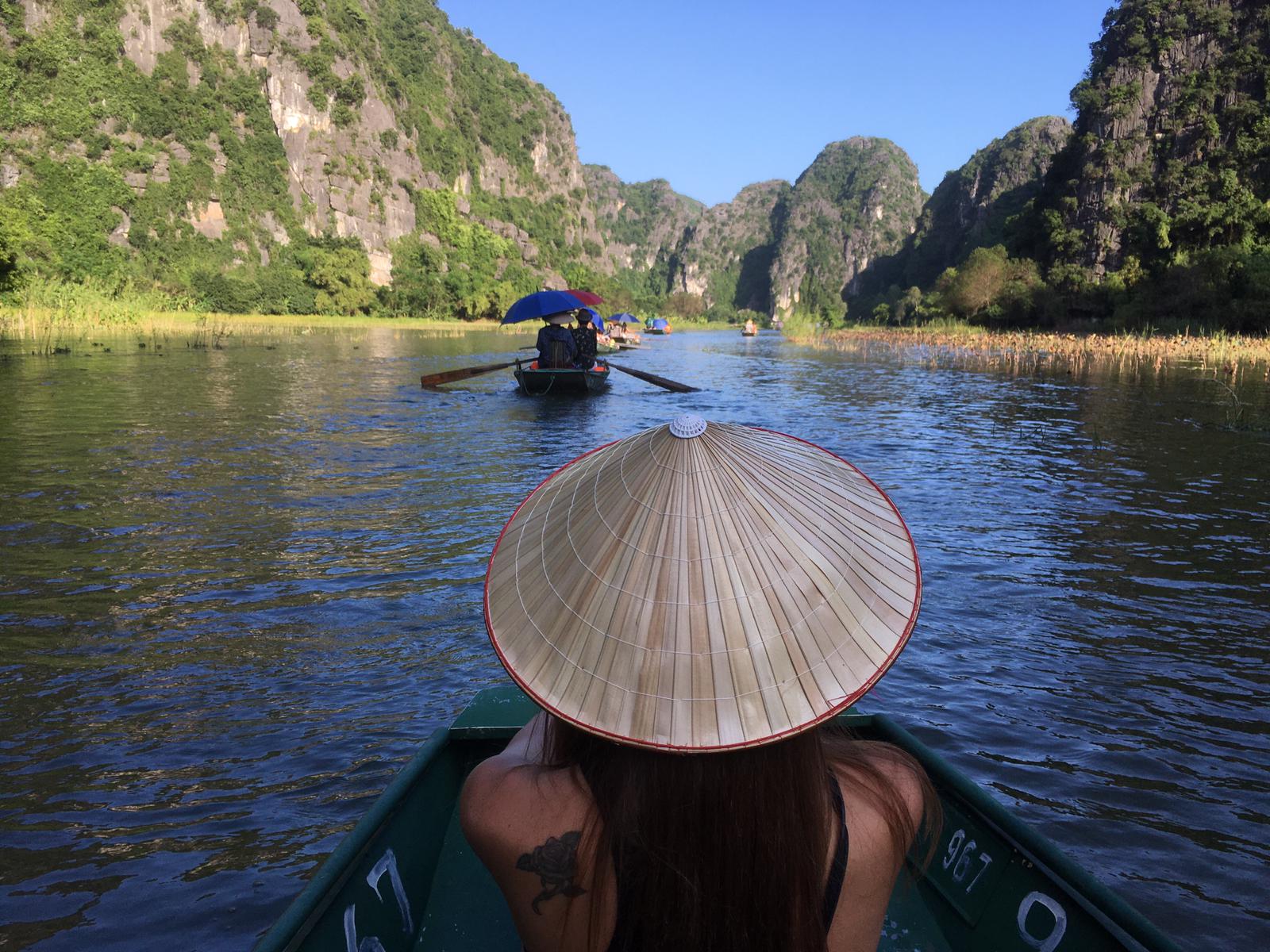 Llegamos a Ninh Binh y fuimos directos a subir el monte Mua antes de pasar por nuestro hotel. Nuestro guía se encargaba de dejar el equipaje a buen recaudo. Ninh Binh está rodeado de un parque con un lago y muchas flores de loto. Todo un espectáculo para la vista. Muy bonito y cuidado. Subimos con mucha calma porque son un montón de escaleras muy empinadas y el calor es considerable así que poquito a poco llegamos a la meta y ¡vaya vistas! Desde luego el esfuerzo merece muchísimo la pena. Desde arriba se ve todo el valle, el mar.... ¡precioso! No hay nada de contaminación, un montón de coloridas mariposas enormes ... El guía nos dijo que “ dónde no hay nada de contaminación es a dónde van las mariposas” y claramente es así porque estaba todo llenito de ellas ¡Naturaleza pura! Después de disfrutar de las vistas nos fuimos a dar un paseo en barca por Tam Coc. Un paseo realmente agradable. Siempre rodeados de naturaleza, montañas con diferentes formas, cuevas ... todo sinónimo de paz y relax