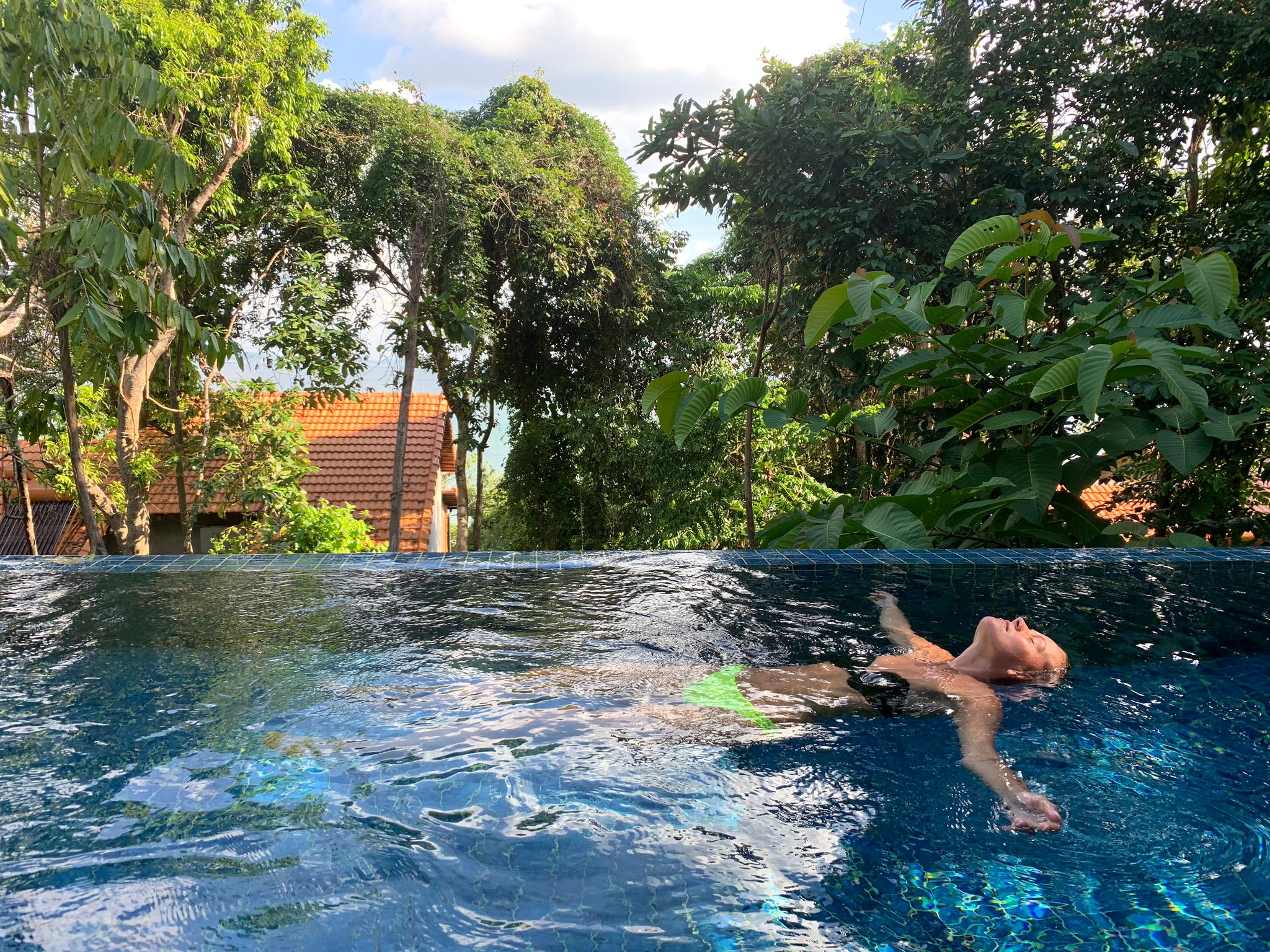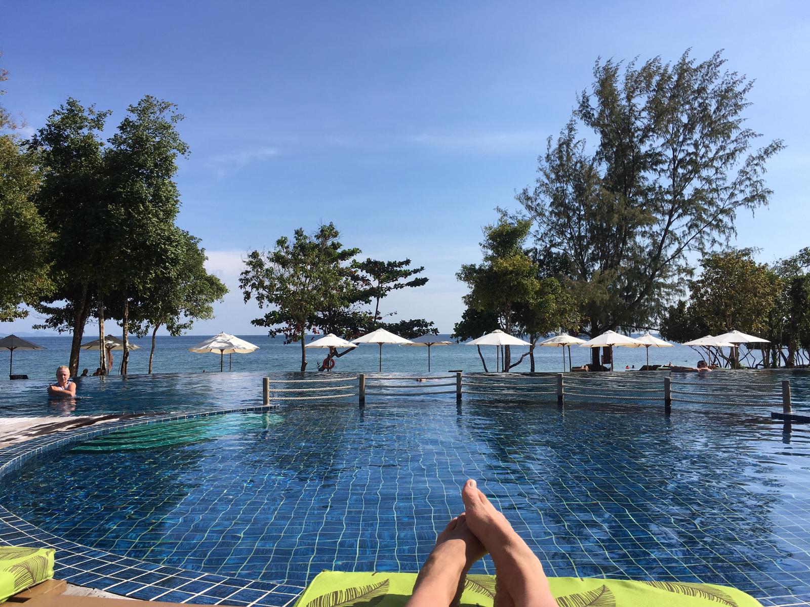La playa privada de nuestro hotel, Green Bay Phu Quoc, era perfecta. Pequeña, sin apenas gente, tumbonas y sombrillas disponibles para todo el mundo y con la piscina del hotel y el bar justo al lado. Aguas color esmeralda y templada; estábamos felices con la buena elección final que hicimos