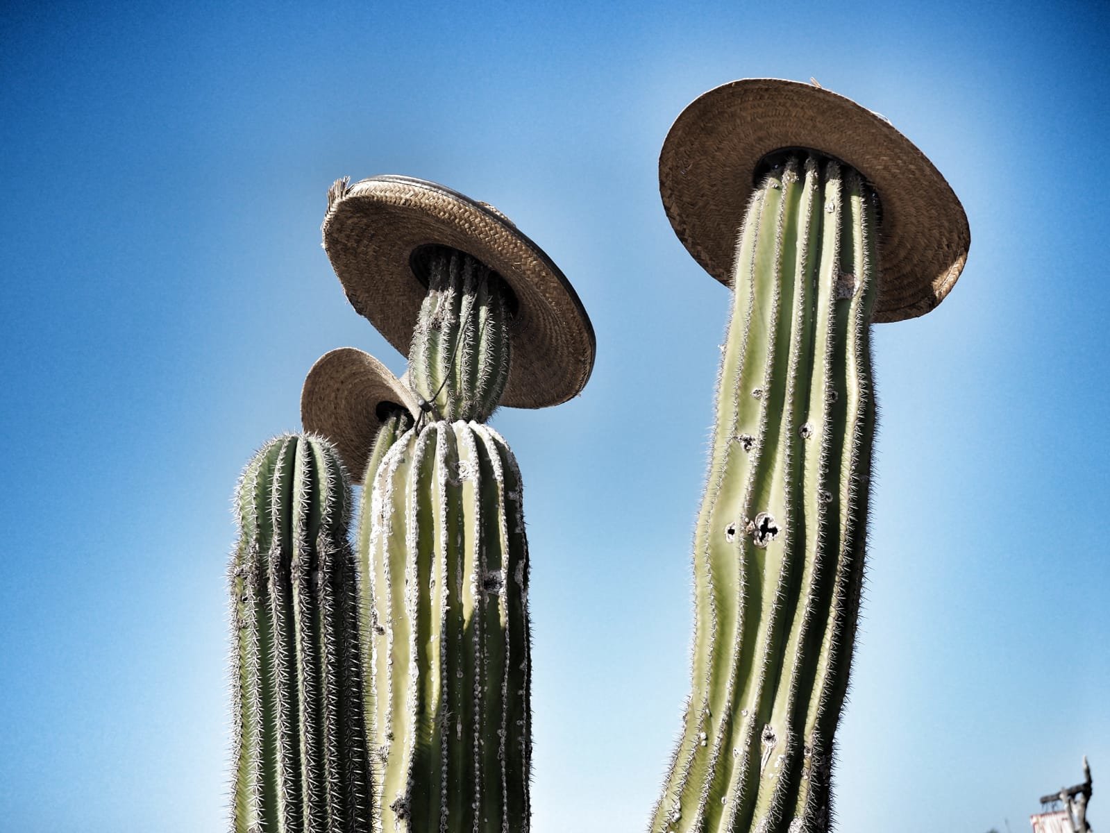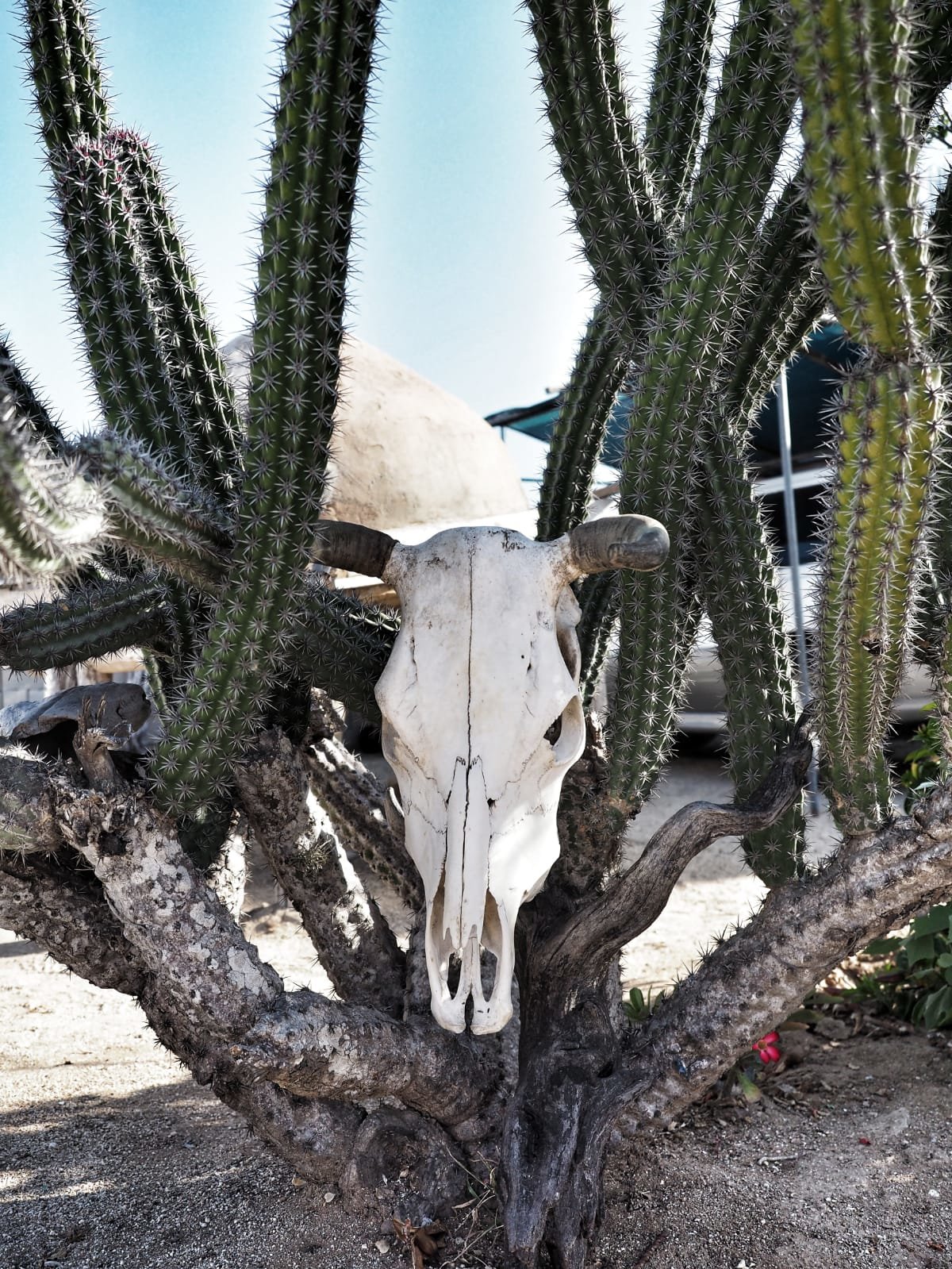 Poco antes de llegar a Todos Santos –uno de los llamados Pueblos Mágicos-, hicimos una parada en la tienda de Justina para conocerla. Un enorme letrero en lo alto del tejado del taller da la bienvenida a los posibles clientes y amigos. Aparcamos en la zona trasera, donde se encuentra su casa. Lo primero que vi al bajar del coche fue un cactus con tres brazos coronados por sombreros. Y después un pequeño porche lleno de niños de todas las edades que, tumbados en el suelo, estudiaban o jugaban en completa tranquilidad.