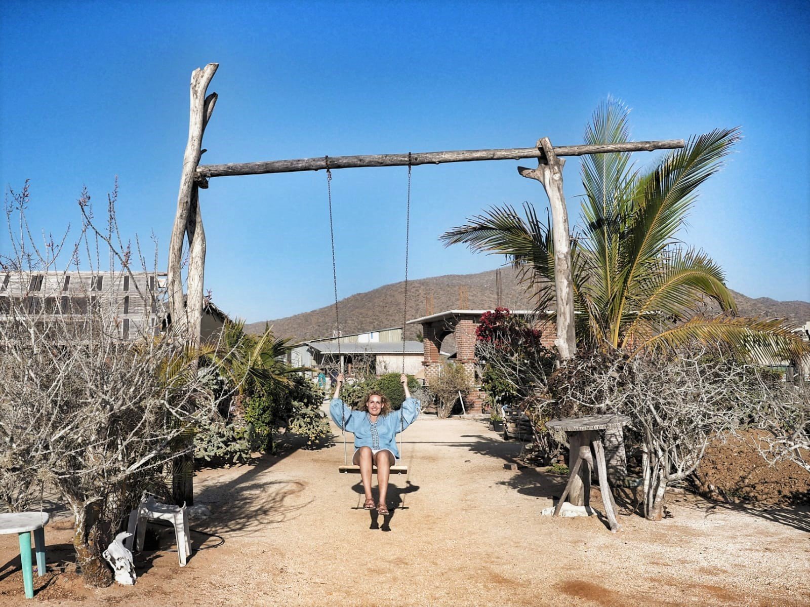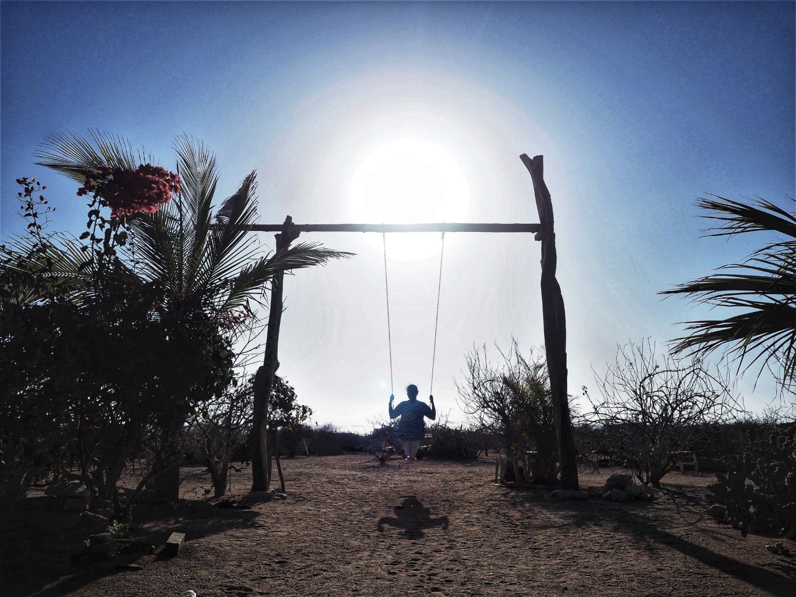 A día de hoy Justina tiene varias tiendas y vive en ésta que visitamos. También tiene 8 hijos y 23 nietos. Observo a algunos de ellos riendo y charlando desperdigados por el suelo del fresco porche de madera, protegiendo con su sombra a esta preciosa familia. El jardín –si así se puede llamar a este trocito particular de desierto- está lleno de detalles coloridos: platos colgados de cactus, pajaritos de madera en los arbustos, huesos de animales y cornamentas. Y encuentro el tesoro de esta casa: un balancín artesanal hecho con ramas y desde el que se puede ver la puesta de sol mientras uno se columpia en la quietud de la tarde. Allí abajo está el mar, el increíble mar abierto, donde un día tras otro esa bola de fuego se sumerge y renace al otro lado.