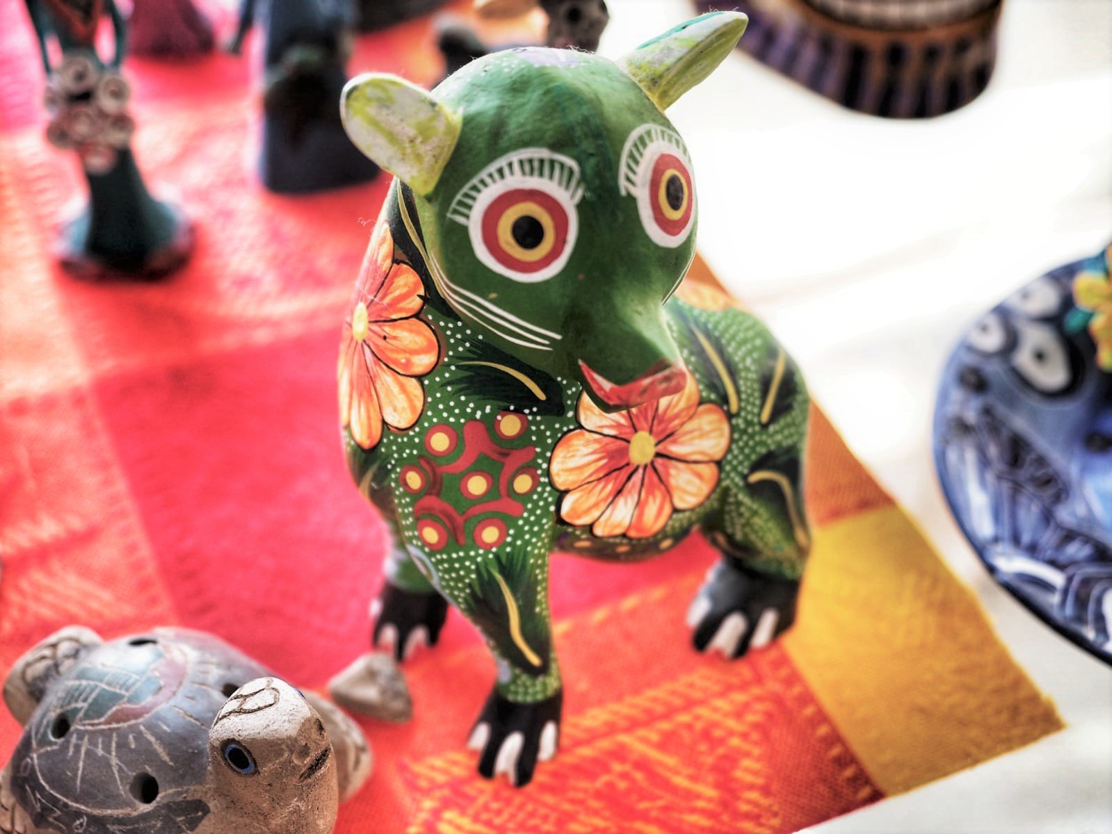 En la tienda Justina vende de todo: cojines, hamacas, mantas, alfombras, cuadros, tapices, cerámicas. Todo con sabor a puro México. Aquí descubrí un elemento que me fascinó: los alebrijes. Se trata de figuras hechas con cartón o madera que simbolizan los miedos que tiene dentro cada ser humano. Es decir, que cada uno de nosotros tiene su propio alebrije. Están formados por la mezcla de varios animales –elementos como alas, colmillos, espinas, cuernos, plumas-, pintados de colores vibrantes. Esos pequeños seres imaginarios conforman un caleidoscopio de personalidades e ideas múltiples. Representan únicamente a la persona que los imaginó, no puede haber dos iguales.