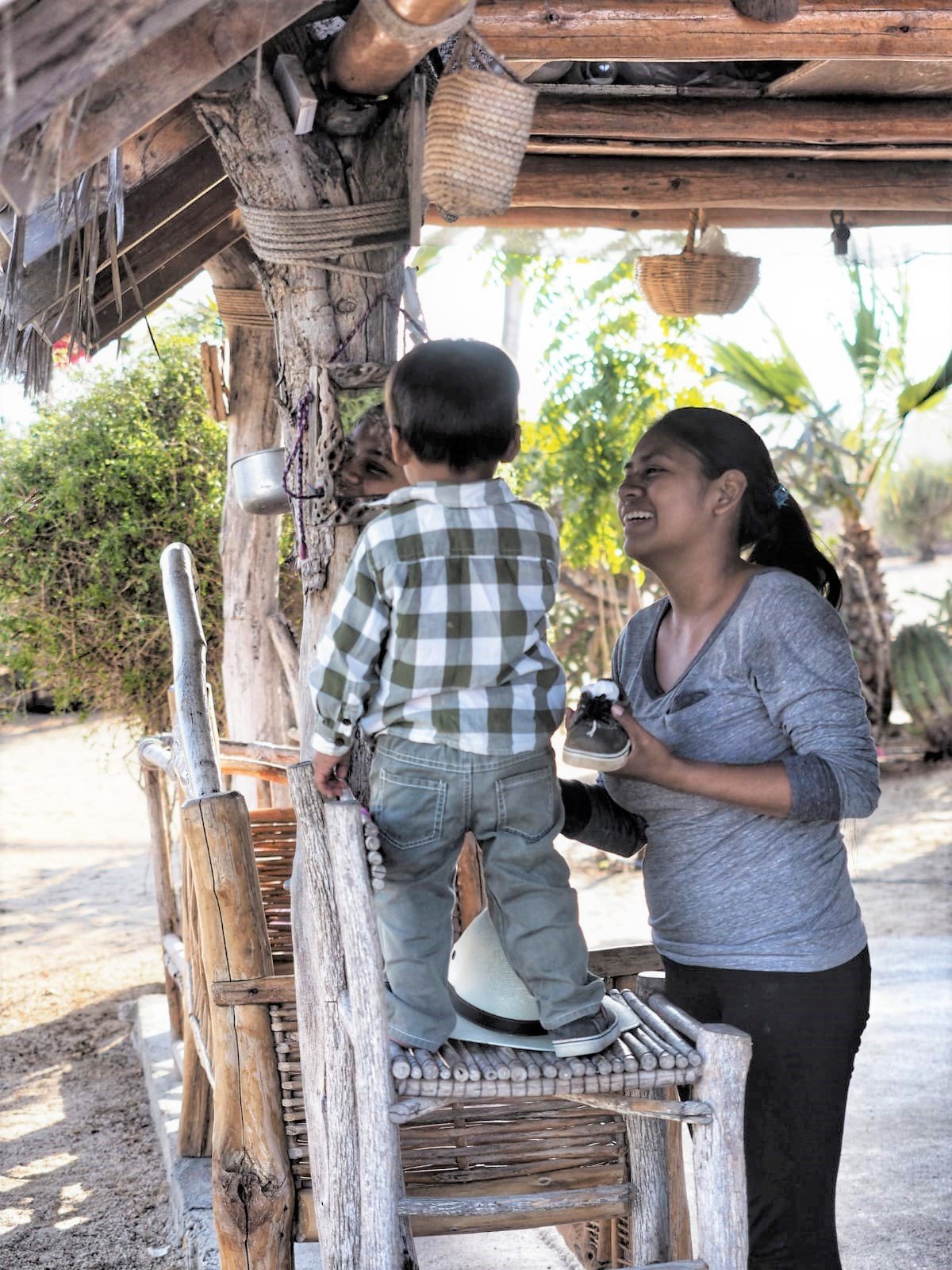 Me cuenta Justina que los niños de ahora no son como los de antes, que saben mejor lo que quieren, que tienen opiniones. Me habla de los platos que les prepara siguiendo las recetas de la deliciosa comida mexicana. Y que protestan cuando no les gusta, algo que sus hijos no hacían. Mientras hablamos veo a uno de los pequeñuelos, vestido con una camisa a cuadros diminuta y aires de cowboy, que trepa por una silla alta para mirarse en el espejo que cuelga de una columna del porche. Enseguida se acerca su madre para vigilar que no se caiga y sonríe. Me encanta ese detalle coqueto del chiquitín mirándose reflejado en un trozo de cristal.