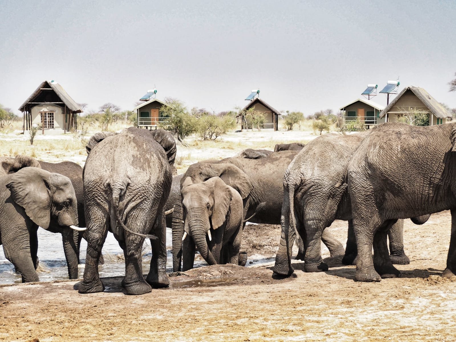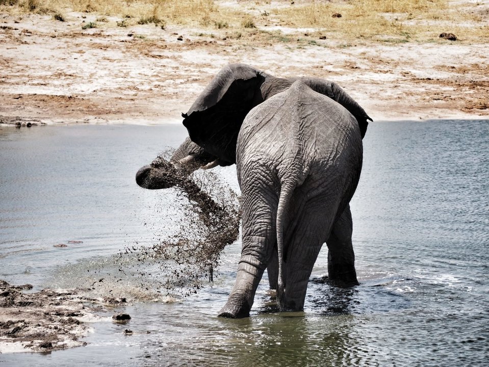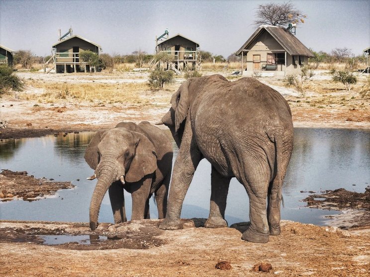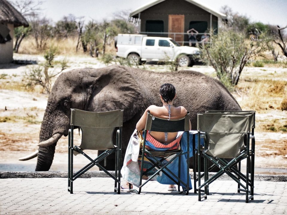 Durante un viaje por Botswana, la primera vez que fui a África, acampé en un lugar llamado Elephant Sands. Hacía mucho calor y nada más llegar, nos fuimos a beber algo fresco en su bar. El principal atractivo de este alojamiento es que tiene una terraza desde la que se ve una charca natural. Al otro lado de la misma hay una hilera de cabañas que se alquilan y también las zonas de acampada como la nuestra. Mientras uno está tomando algo o bañándose en la piscina puede ver a los elefantes llegar con sus pesados y secos cuerpos desde el bosque, o aparecer repentinamente entre las cabañas.