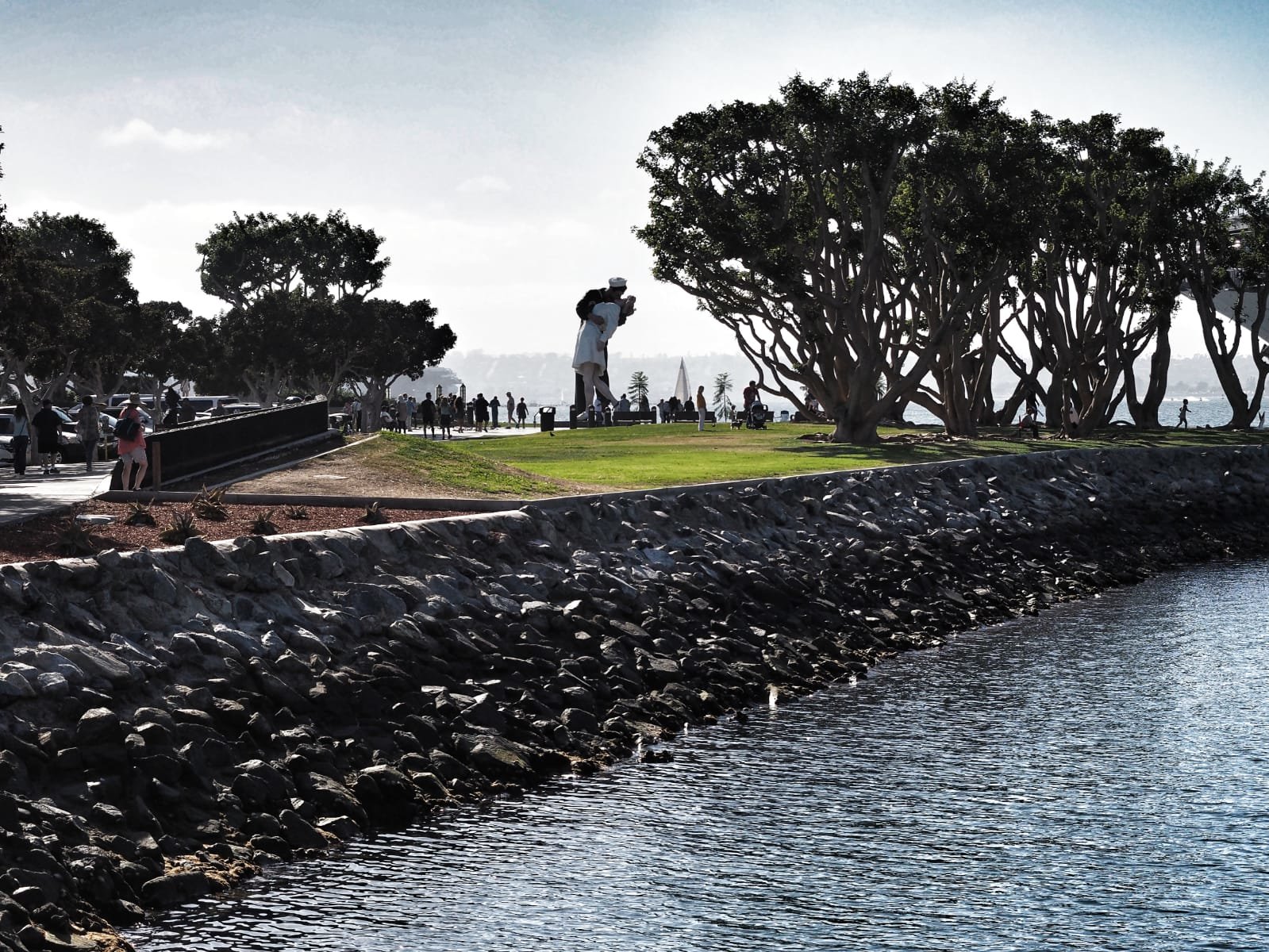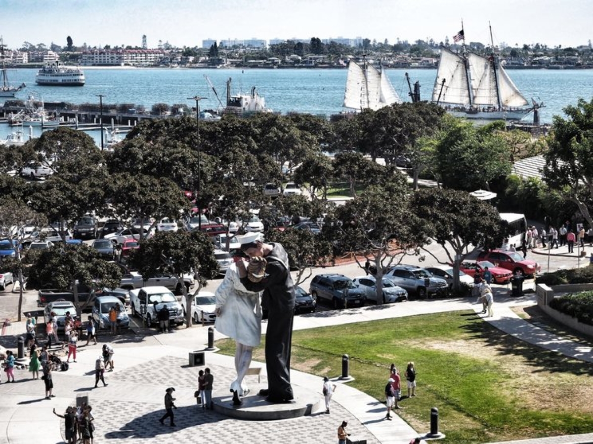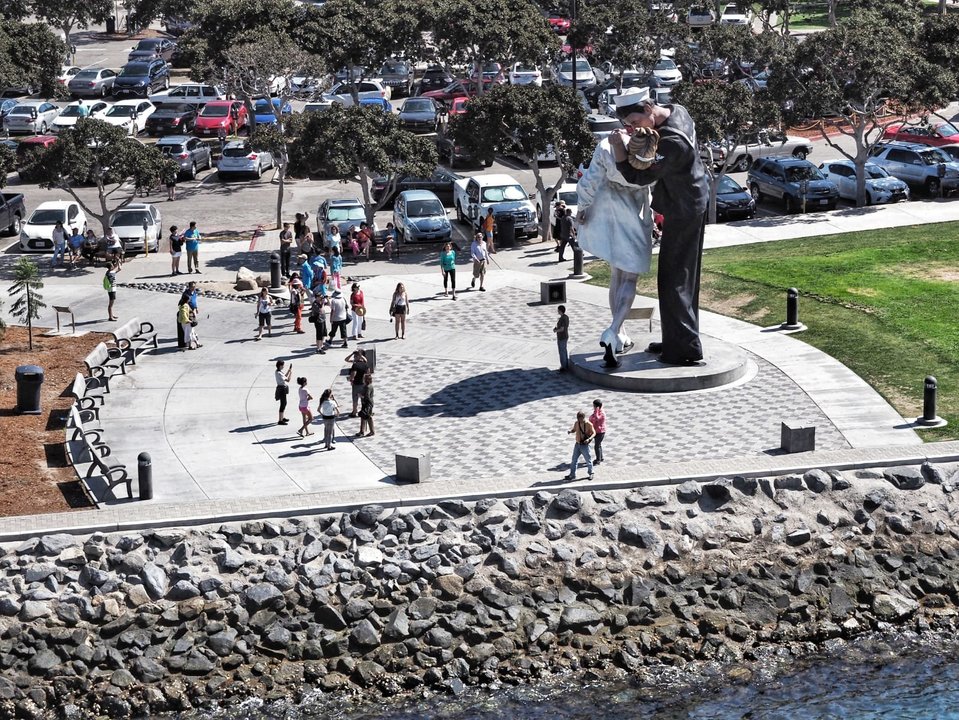 Y para recordarles este beso y su historia, hoy les llevo al puerto de la ciudad californiana de San Diego. Allí, una reproducción gigantesca de esa pareja que todos conocemos, hace sombra al atardecer sobre las olas. La gente se acerca a admirarla y a sentirse un poco pequeñita. Se comen un helado apoyados en las piernas interminables del marinero. Y todos podemos soñar que somos los protagonistas de ese beso con mayúsculas que marcó el final de una época y el comienzo de otra. El beso que dejó atrás una maldita guerra y encaminó al mundo hacia la ansiada paz.