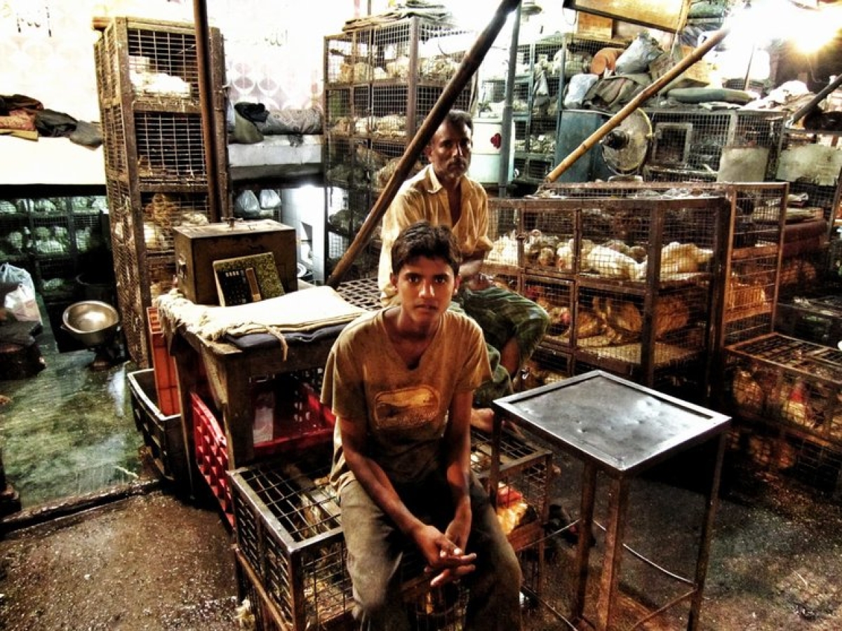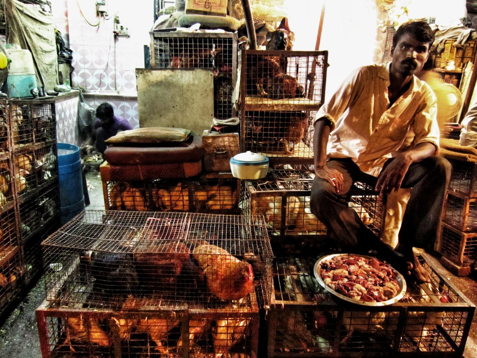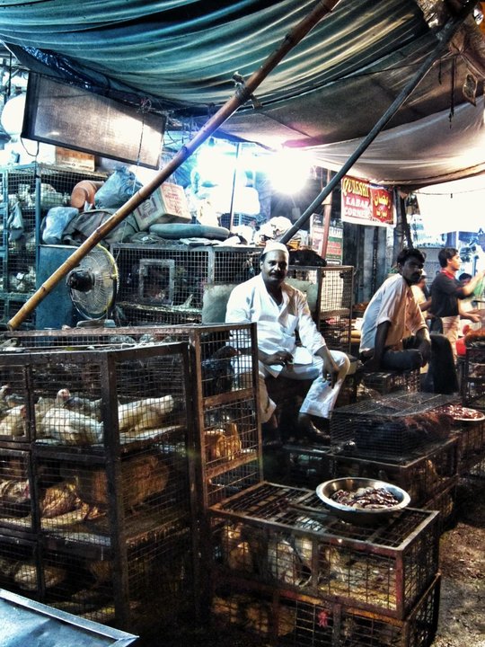 Ninguna fotografía les va a contar lo que se siente allí en medio de las jaulas llenas de pájaros. El ruido es ensordecedor, huele a curry y otras especias que soy incapaz de distinguir, la gente habla a voces y a lo lejos se oyen miles de coches pitando sin parar. El ambiente está tan cargado que cuesta respirar, hay que masticar el aire. Y los hombres observan sentados sobre las jaulas, poniendo en recipientes los trozos de carne y abanicándose. El tiempo transcurre de otro modo, a otra velocidad. Y todos –también yo- entramos a formar parte de ese paisaje efímero y cautivador.