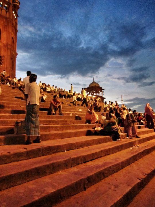 Hablemos de paisajes humanos. Para ello, les llevo hoy a un mercado de aves al lado de la mezquita Jama Masjid, en la inmensa Nueva Delhi. Al anochecer, los fieles acuden al rezo y después se quedan sentados en la escalinata hablando y viendo la vida pasar.
