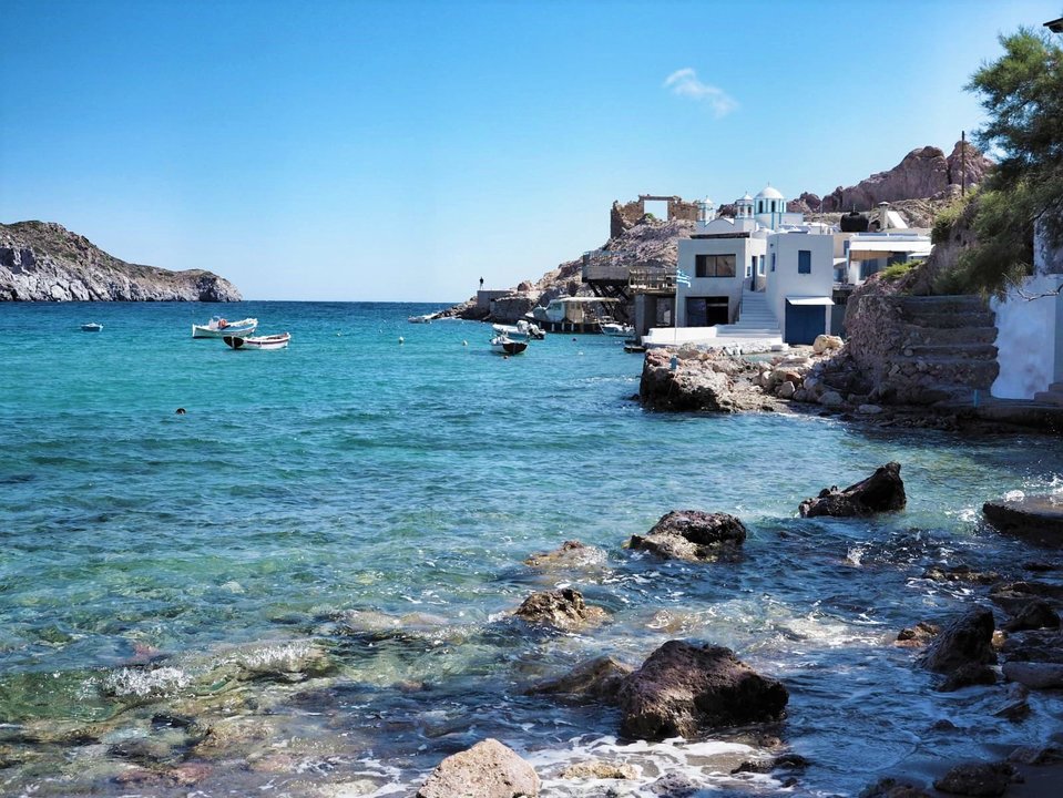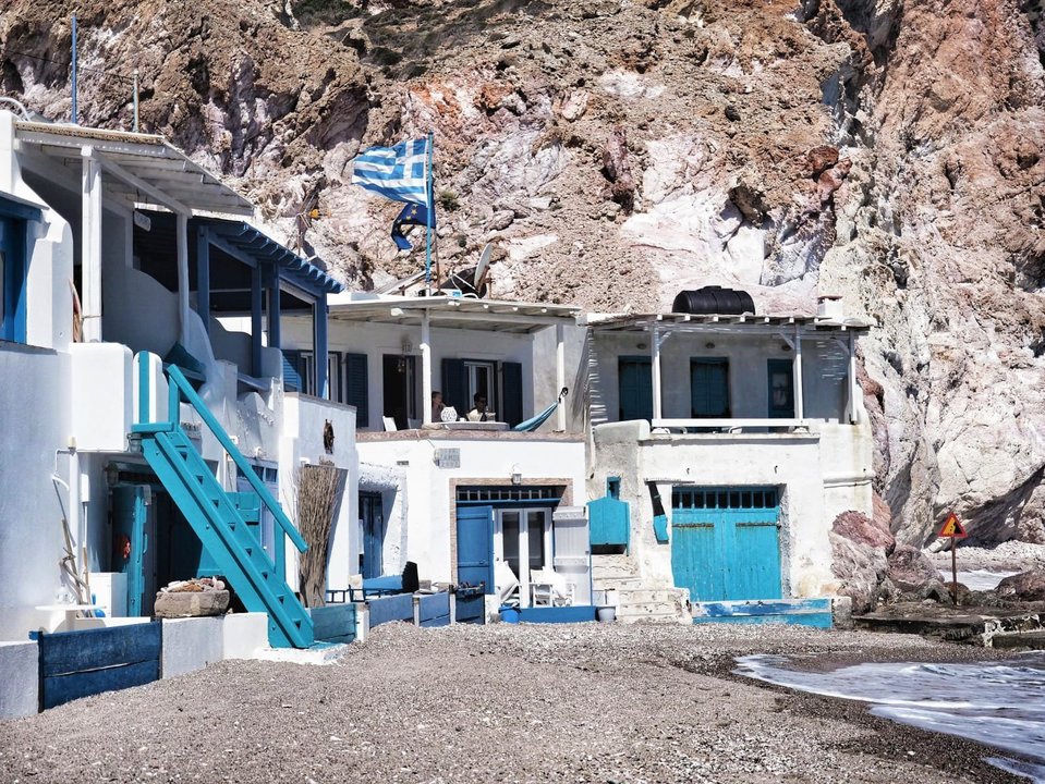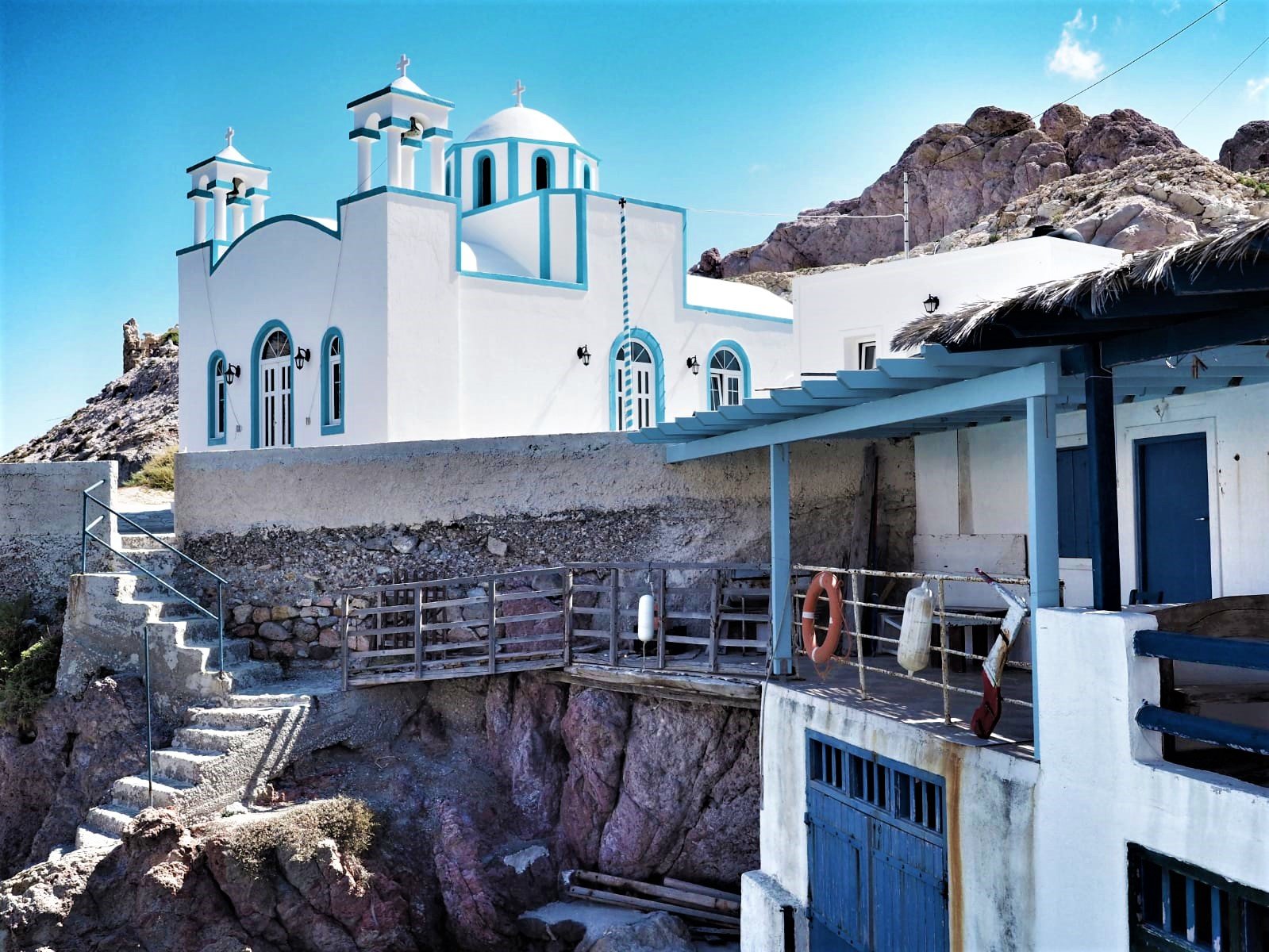 Cuando lleguen verán a la izquierda una pequeña playa de piedras con árboles y algún chiringuito que sólo abre en temporada alta. Y a la derecha las casitas típicamente griegas de los últimos pescadores que habitan este paraíso. Se trata de un cúmulo de construcciones en la roca cuyo mayor símbolo es una iglesia de arquitectura muy simple pero bellísima. Y no pueden faltar las banderas ondeando. También hay unas ruinas de algo que en algún momento quiso ser una casa pero dejaron a medias. Pues hasta eso es bonito en nuestra postal.