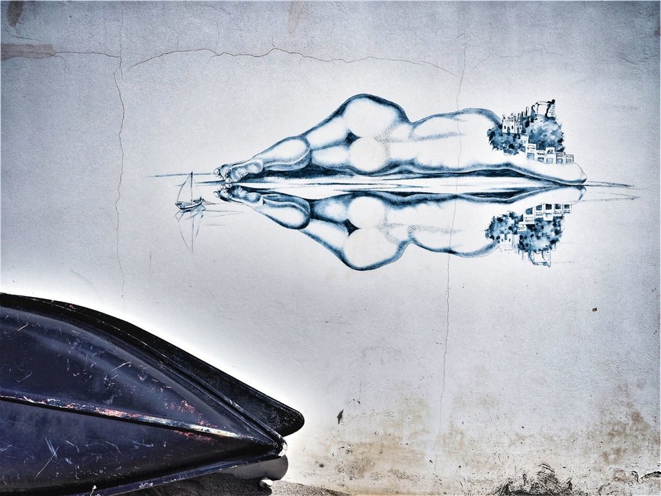 En la parte baja del pueblo, a pie de playa, están los cobertizos que los pescadores utilizan para guardar sus barcas cuando vuelven de la faena o hay temporal. También hay una pared pintada de blanco que tiene en el lateral un dibujo precioso. Representa el cuerpo desnudo de una mujer tumbado lateralmente que se refleja como un espejo en el mar, donde hay una pequeña embarcación flotando. La cabeza de la mujer guarda entre sus cabellos una imagen del pueblo, que parece deslizarse y caer lánguidamente sobre su brazo. Nunca verán algo así en un museo pero a mí me pareció una auténtica obra de arte.