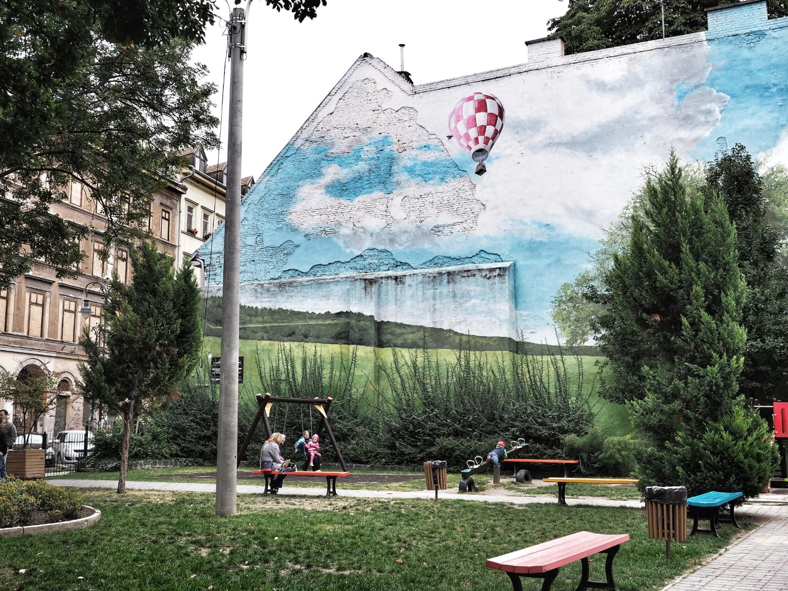 Otro de mis destacados es el titulado "Patio de juegos nuboso". En la tapia que delimita un pequeño jardín con columpios donde los niños juegan, han dibujado una perspectiva de campo abierto con un cielo azul y nubes en el que destaca un globo aerostático de cuadros rojos y blancos. Los cielos grises de Budapest son el contraste perfecto para este reducto de primavera y el mensaje de libertad que imprime ese globo flotando en el horizonte invita a soñar.