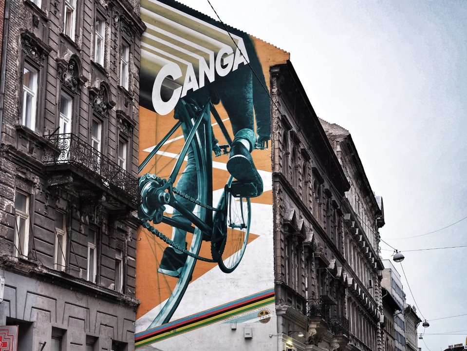 Para los amantes de la bicicleta hay también un mural, "Canga", en el lateral de otro de los edificios de este popular barrio, donde se ven las piernas de un ciclista pedaleando a toda velocidad. El proyecto La Ciudad de Colores nació en 2008 y cada año celebra un festival, Színes Város, donde a lo largo de un mes se producen distintos eventos culturales y muralistas locales o venidos de todo el mundo se organizan para seguir llenando de color las fachadas de Budapest.