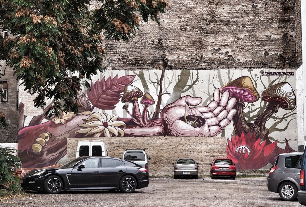 La mayoría de estos murales que les muestro están pintados por una asociación local llamada Neopaint y agrupa a los graffiteros de la ciudad. Qué me dicen de este aparcamiento adornado por esas inmensas flores y setas, y esa mano agujereada por la naturaleza, secándose como un tronco muerto…