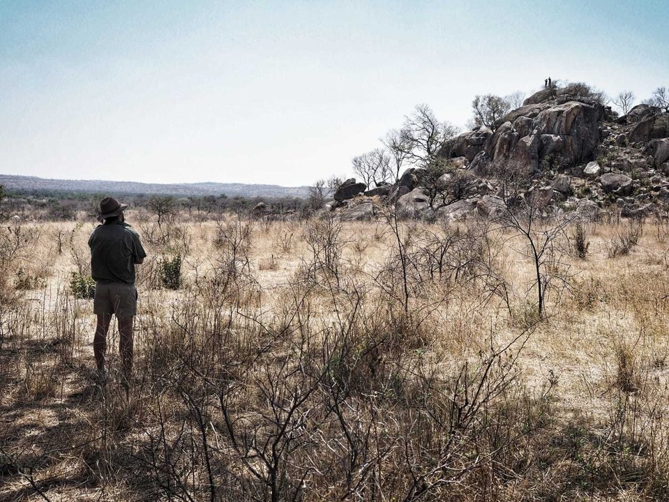 Caminamos bastante rato por una preciosa llanura seca y amarilla bajo un sol ardiente e implacable. Algunos árboles estaban floridos y daban colorido al paisaje. Nuestros expertos subieron a una montaña de rocas que los locales llaman kopjes, cantos rodados de enorme tamaño. Algunas se mantienen en imposible equilibrio y vistas de lejos pueden dar lugar a formas igual que sucede con las nubes. Desde abajo les veía mirar al horizonte a través de sus prismáticos buscando pistas y huellas del solemne animal.