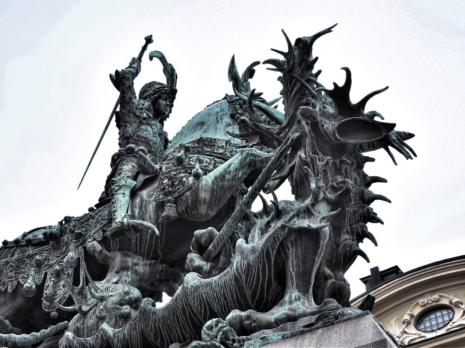 Otro de los símbolos de Estocolmo se encuentra en la plaza de Köpmanbrinken. Se trata de la escultura en bronce de San Jorge y el dragón. Cuenta la historia de un dragón que anidó en la fuente que proveía de agua a la ciudad de Silene. Sus habitantes, aterrorizados, realizaban sacrificios humanos para conseguir el agua que necesitaban, hasta que llegó el turno de Cleolinda, la hija del rey. Para evitar su muerte, San Jorge luchó contra el dragón hasta cortarle la cabeza y resultó victorioso, salvando a la princesa. Se le representa blandiendo su espada en alto, montado sobre su caballo mientras el dragón se retuerce bajo ellos intentando defenderse. También está la princesa implorando acompañada de una oveja que simboliza la sumisión. Según la leyenda, San Jorge habló después con los habitantes de Silene de un modo tan cautivador que les convenció para convertirse al cristianismo.